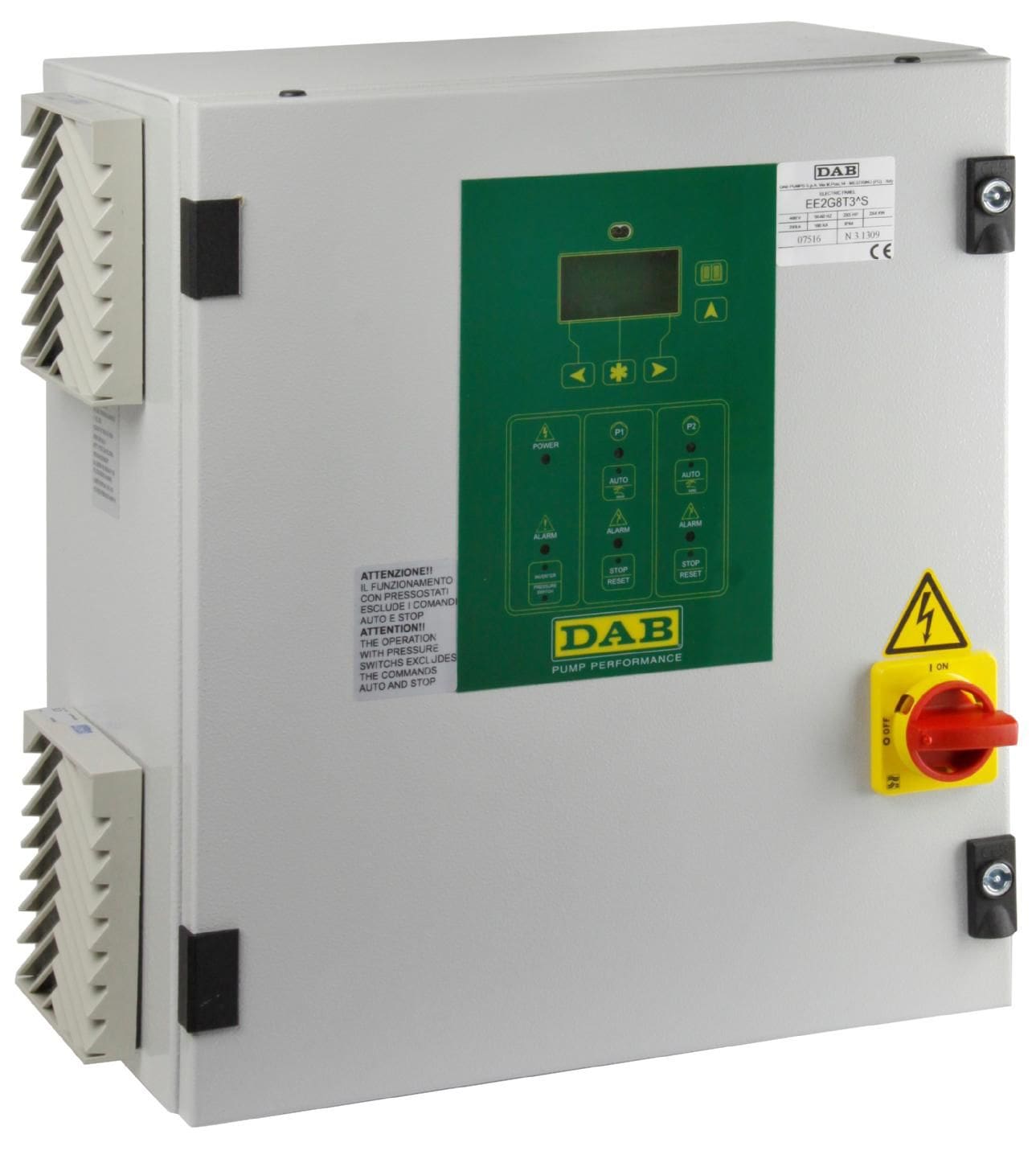DAB инвертор управления и командования EEG, EE2G, EE3G — Скорость вращения электрического насоса (серия EEG), для поддержания постоянного давления в системе переменного расхода воды. В распределительных щитах для двух (серия EE2G ) и трех (серия EE3G) электронасосов, второй и третий электронасосы включаются в каскад для поддержки первого, после увеличения потребности в воде.Поставляется в стандартной комплектации: