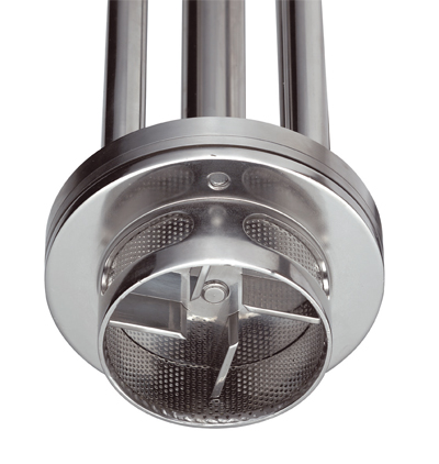 Высокая скорость и выверенные допуски ротора и статора имеют результатом высокий всасывающий потенциал, продукт всасывается со дна ёмкости и направляется в центр рабочей насадки. Продукт всасывается в нижнюю часть ротора и радиально им выбрасывается. Проходя через отверстия статора, происходит механическая резка продукта при скорости 20 м/с. ? затем продукт испытывает гидравлическую резку, проходя через отверстия статора на большой скорости. ? снова продукт возвращается в рабочую насадку, обеспечивая непрерывную и мощную циркуляцию внутри ёмкости.