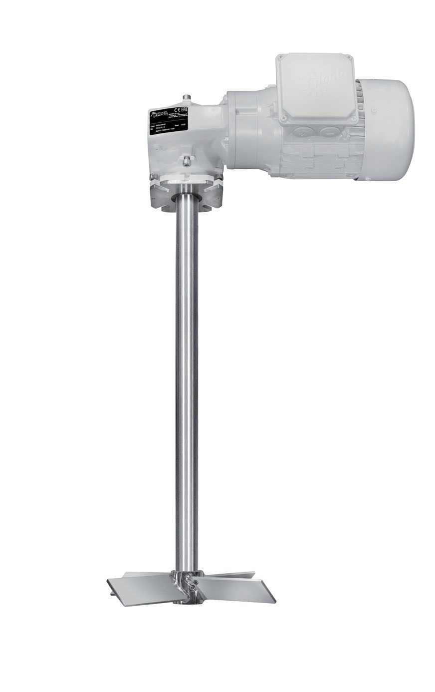Вертикальная мешалка. Уплотнение: торцевое и кольцо сальника. Пропеллер закреплен на валу винта крышки. IEC двигатель, IP55, изоляция класса F.. Мощность подключения: 3 кВт. Пропеллер с 2 или 4 наклонными лопастями.