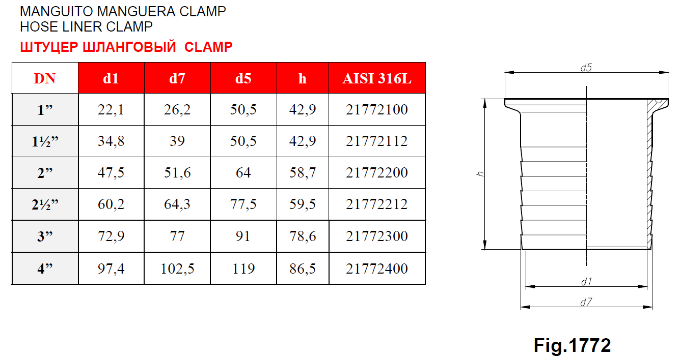 штуцер шланговый clamp aisi 316l (hose liner clamp) dn 1” art. T1610-0706025 AISI 316L